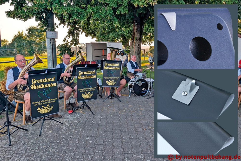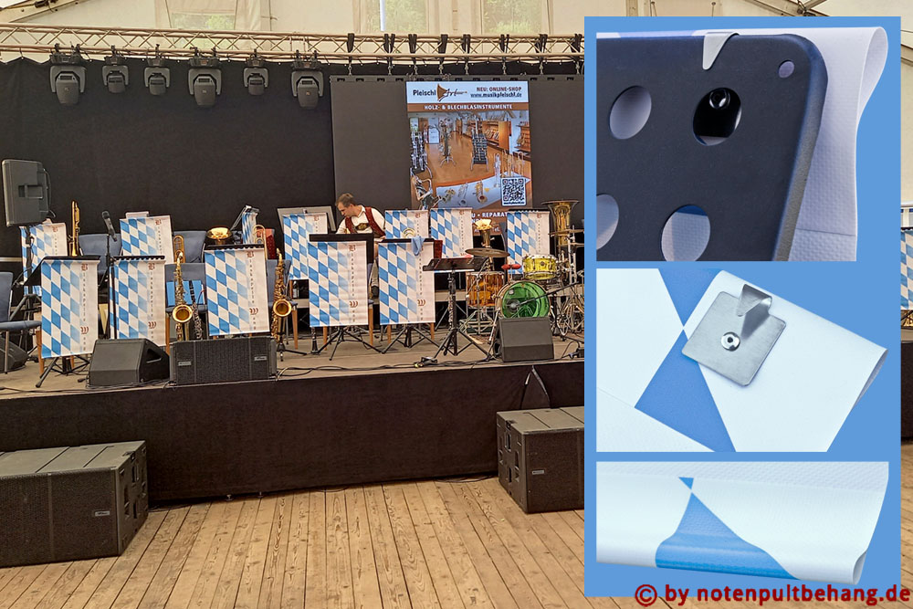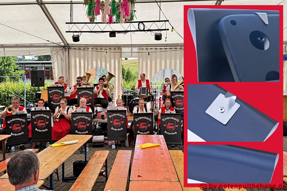 50 x 70 cm mit 5 cm Hohlsaum oben und 2 cm Hohlsaum unten, die großen Haken für gebördelte Notenständer sind 8 cm vom linken und rechten Rand entfernt. Dieser Behang wurde in 2 Ausführungen erstellt, einmal mit dunklem (rotem) Hintergrund und einmal die helle Ausführung mit weißem Hintergrund.